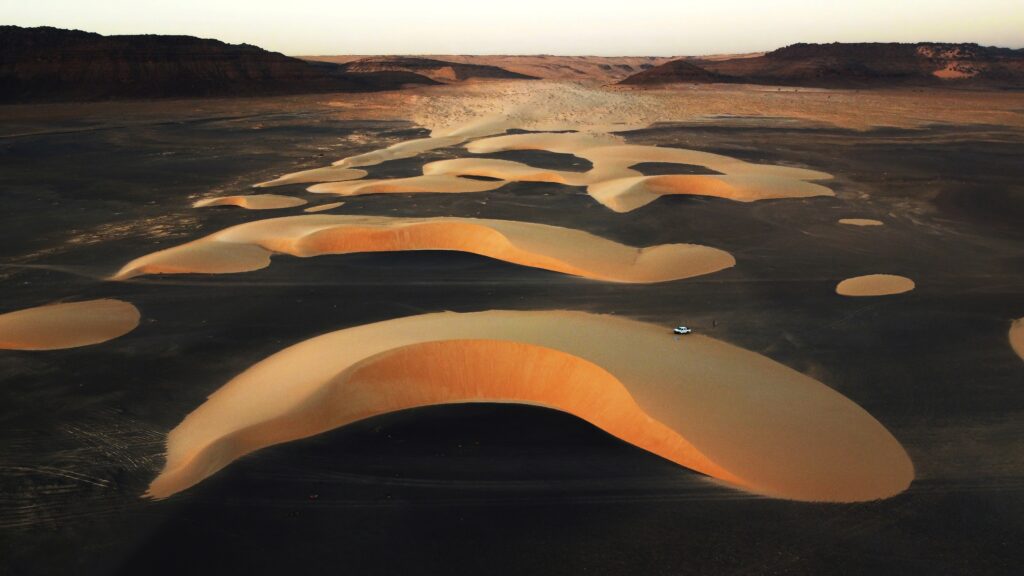 We knew where we were headed. The Ubari lakes region is a place full of history made of geological eras of an impactful force. Once a boundless body of water comparable in size to today’s Czech Republic, this area is now a vast expanse of sand and towering dunes.