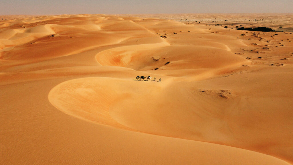 A slow pace and constant march crossing the desert dunes in the Sahara with our caravan of three camels and our chameliers. It was exactly how I imagined and visualized it back home. An extraordinary adventure. Twelve kilometres of walking under the scorching sun going up and down these towering sand hills. The silence, the looks and the simple smiles accompanied us until we arrived at this elevated point from which a depression extends between the dunes, a dry area, probably an ancient basin of water. In the middle a large palm grove appeared, almost like a mirage, the Oasis de La Gueila. The oasis represents life, and the possibility of finding food as well as water. Before descending we stopped to admire the sinuosity and elegance of these desert curves, the beauty of nature in its simplicity. Small, in the immensity of the desert we let ourselves go into its greatness where we carry only our shadows, a reflection of our souls.